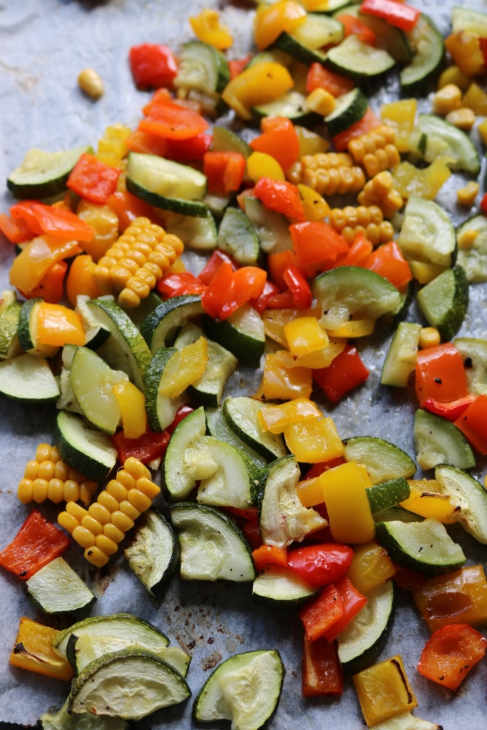 Cukiniją, paprikas ir kukurūzo burbuolę kepiau orkaitėje. Kepiau ant grilio funkcijos. Daržovės iškepė minkštos, bet ne vandeningos. Daržoves supjausčiau nedideliais gabaliukais, tad jos iškepė gana greitai. Cukinijas galima pajsutyti kiek storiau, nes jos kepa šiek tiek greičiau negu paprikos.