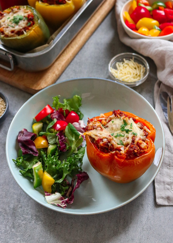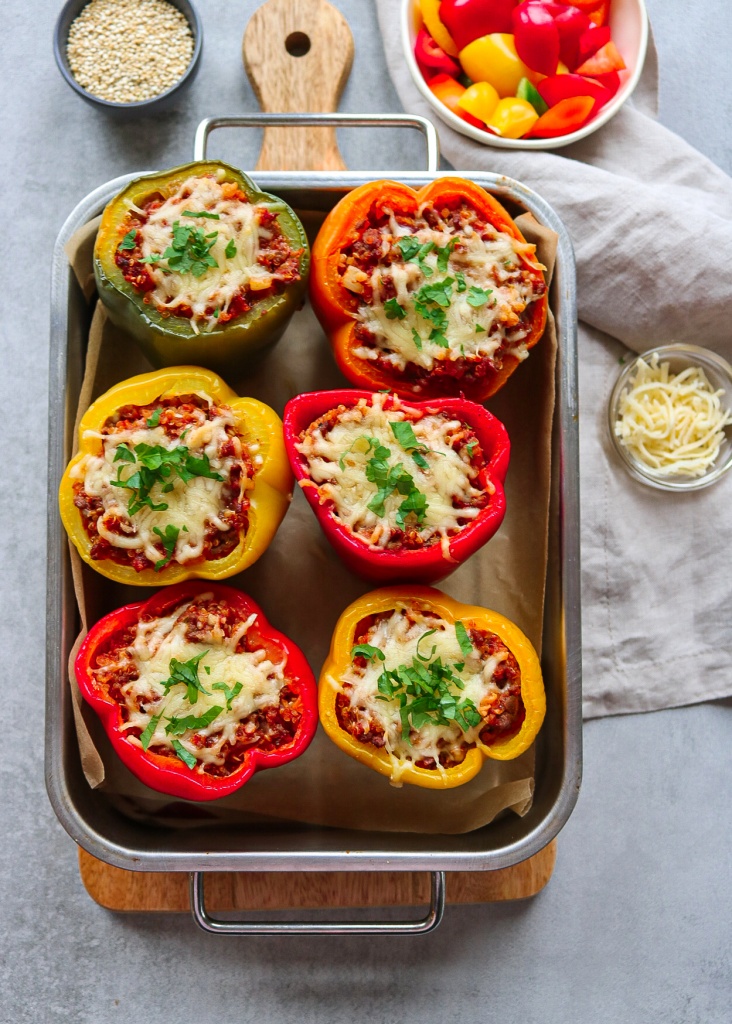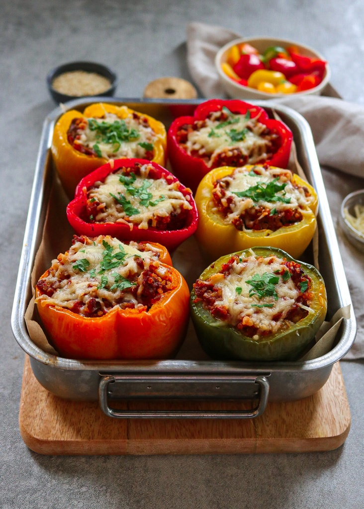 Šias įdarytas paprikas gaminau iš smulkintos jautienos ir bolivinų balandų įdaro. Paprikas naudojau didesnes ir įvairių spalvų. Man pačios skaniausios yra oranžinės ir geltonos spalvos paprikos – jos turi malonų, saldų skonį.