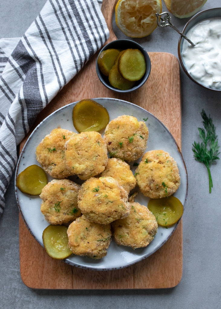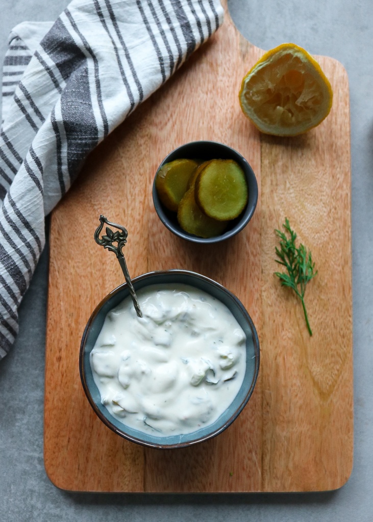 Juos patiekiau su tartaro padažu, kurį gaminau iš graikiško jogurto, marinuotų agurkų. Juos naudojau saldžiarūgščius, todėl padažas buvo labai skanus.