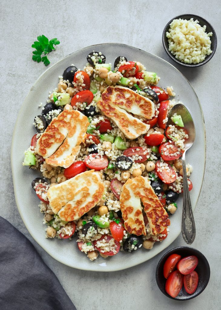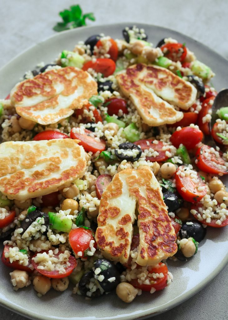 Salotas gaminau su halumio sūriu, kurio būna didesniuose prekybos centruose. Jis tinka grilinimui ar kepimui, nes netirpsta. Jo kilmė siejama su Kipru, dažniausiai gaminamas iš ožkos, avies ir karvės pieno. Sūris yra stipriai sūdytas (pastebėjau, kad kai kurie būna sūresni, o kai kurie mažiau sūrūs), į jo sudėtį įeina mėta.