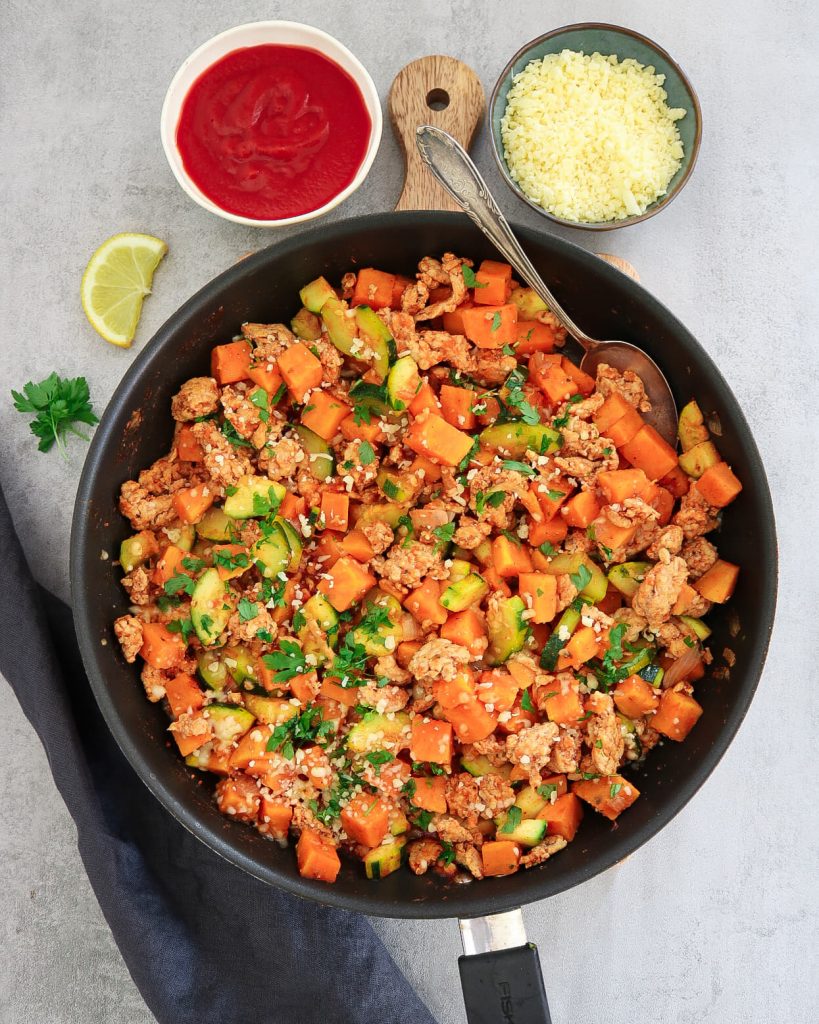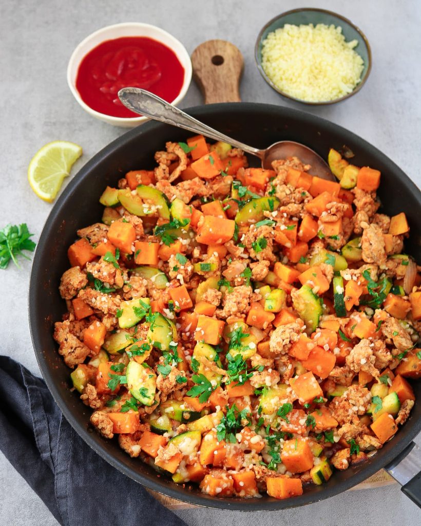 Saldžioji bulvė yra viena mano mėgstamiausių daržovių, todėl vis bandau atrasti skanių derinių su ja. Pasirodo, vištiena, cukinija ir saldžioji bulvė yra labai geras derinys.