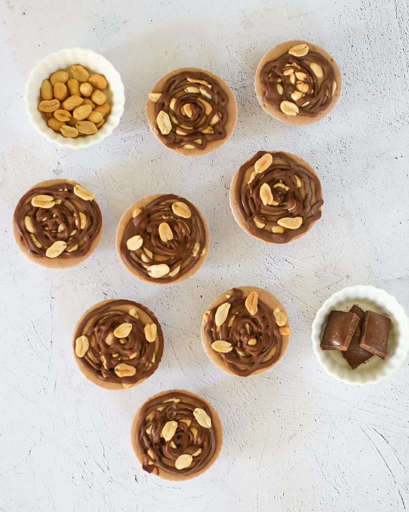 3. Ją supilti į silikonines keksiukų formeles. Apibarstyti riešutais, apšlakstyti šokoladu (naudoti šaukštą ar konditerinį maišelį).