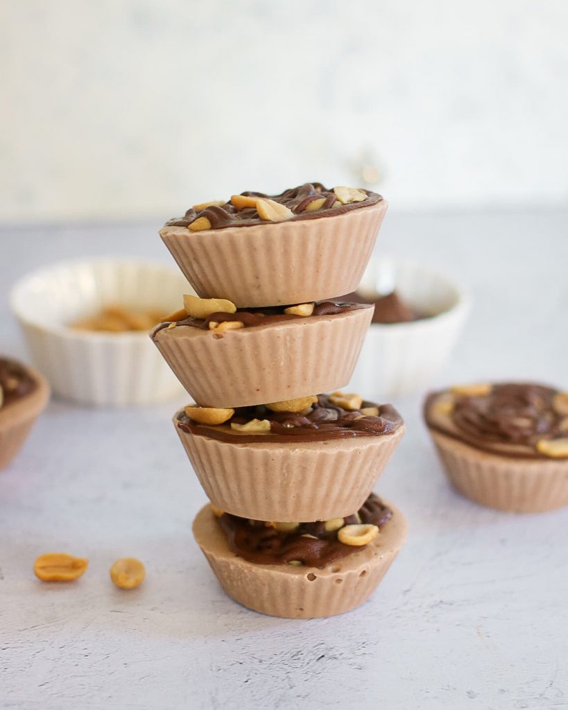 Šie ledai yra „Snickers“ skonio. Naudojau riešutų sviestą, sūdytus ir kepintus žemės riešutus. Juos pirkau parduotuvėje. Labai mėgstu balansą tarp saldumo ir sūrumo. Taip pat dėjau ir graikišką jogurtą. Jis suteikė kremiškumo, panašumo į tikrus ledus. Bananai pridavė natūralaus saldumo. Naudojau juos gerai prinokusius, todėl papildomai nedėjau jokio saldiklio.