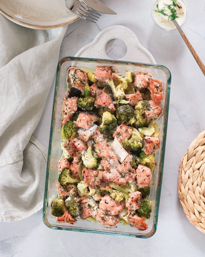 Iš pradžių išviriau bulves, brokolius. Tada sudėjau į kepimo indą kartu su lašišos gabaliukais. Svarbu neperkepti, nes tada lašiša bus sausa.