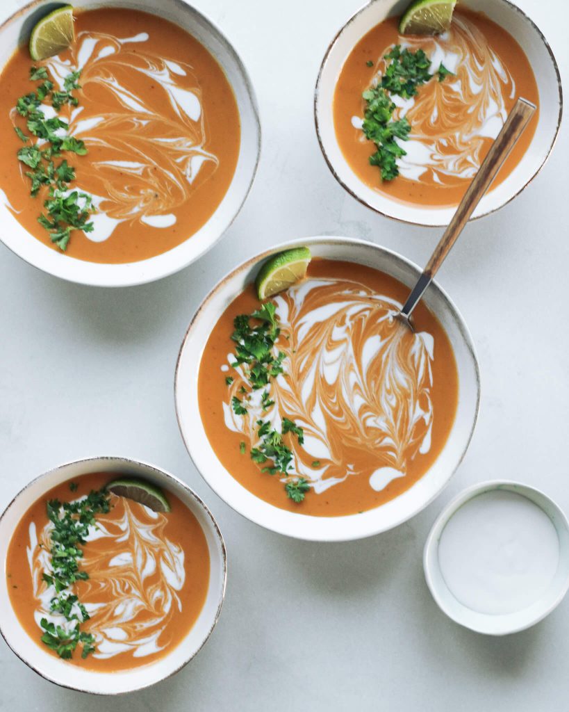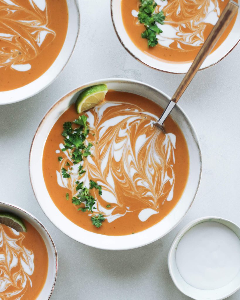 Ši tailandietiška saldžiųjų bulvių sriuba yra saldžiarūgštė. Daug skonio priduoda raudonojo kario pasta. Naudojau „Santa Marios“ pastą.