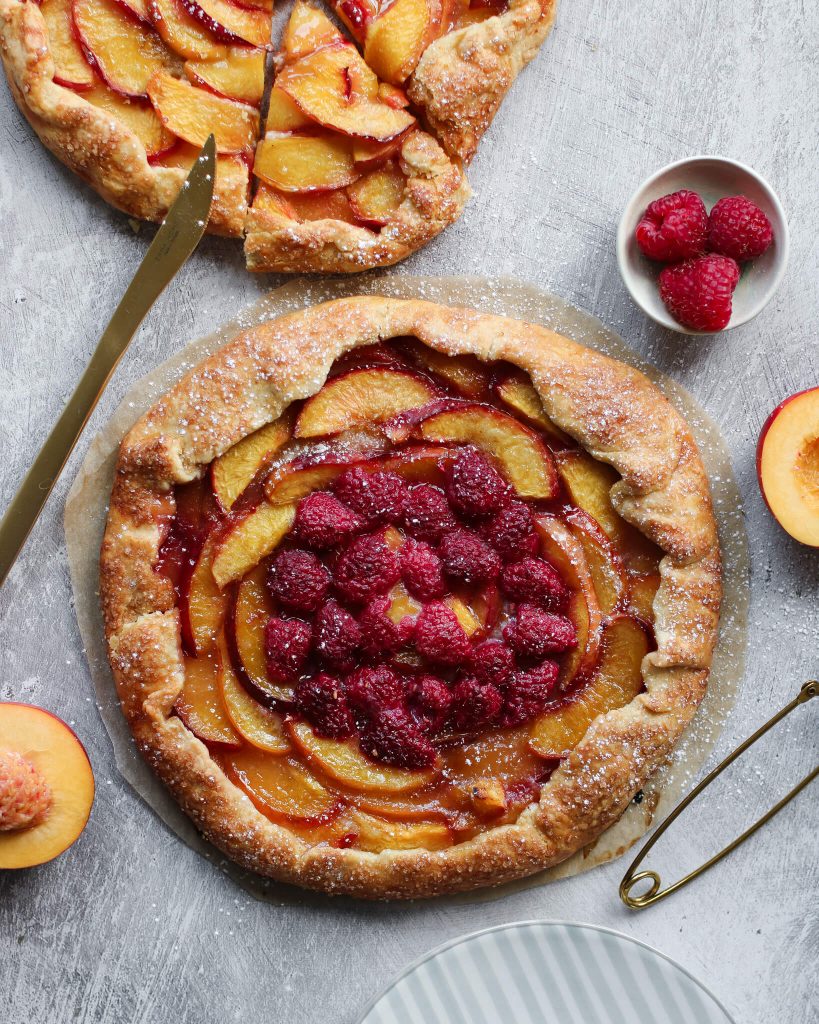 4. Ant tešlos sudėti nektarinus, ant vidurio avietes, paliekant 4 cm kraštą. Juos užlenkti. Kraštus patepti kiaušinio plakiniu.