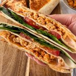 5. Tortiliją perkerpame iki centro. Kairę pusę lengvai patepame padažu, viršuje dedame vištieną. Viršuje dešinėje pusėje – salotų lapus ir pomidorų skilteles. Apačioje vėl patepame padažu, užberiame sūrio.