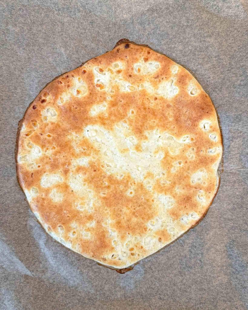 Tešlą pilame ant kepimo skardos, išklotos kepimo popieriumi. Formuojame daugmaž 22 cm skersmens apskritimą. Šaukštu ją palyginame.