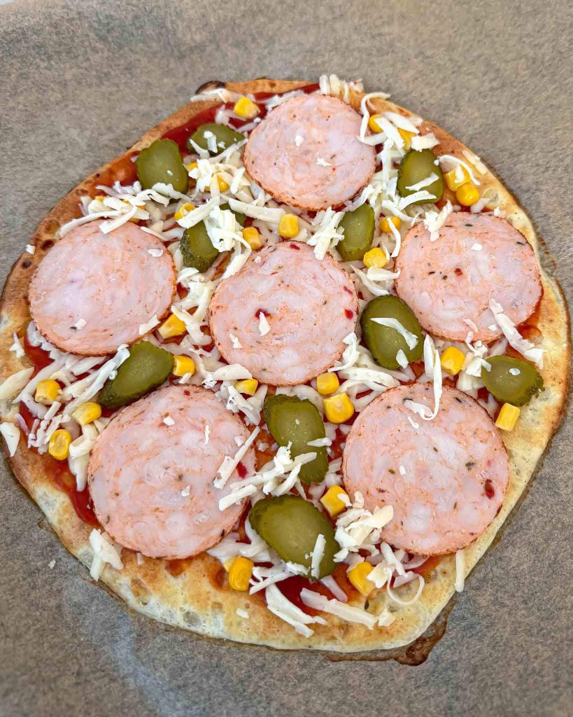 Viršų patepame pomidorų padažu, užberiame sūrio, sudedame kitus produktus, dar užberiame truputį sūrio. Kepame orkaitėje kelias minutes ar kol sūris išsilydys.