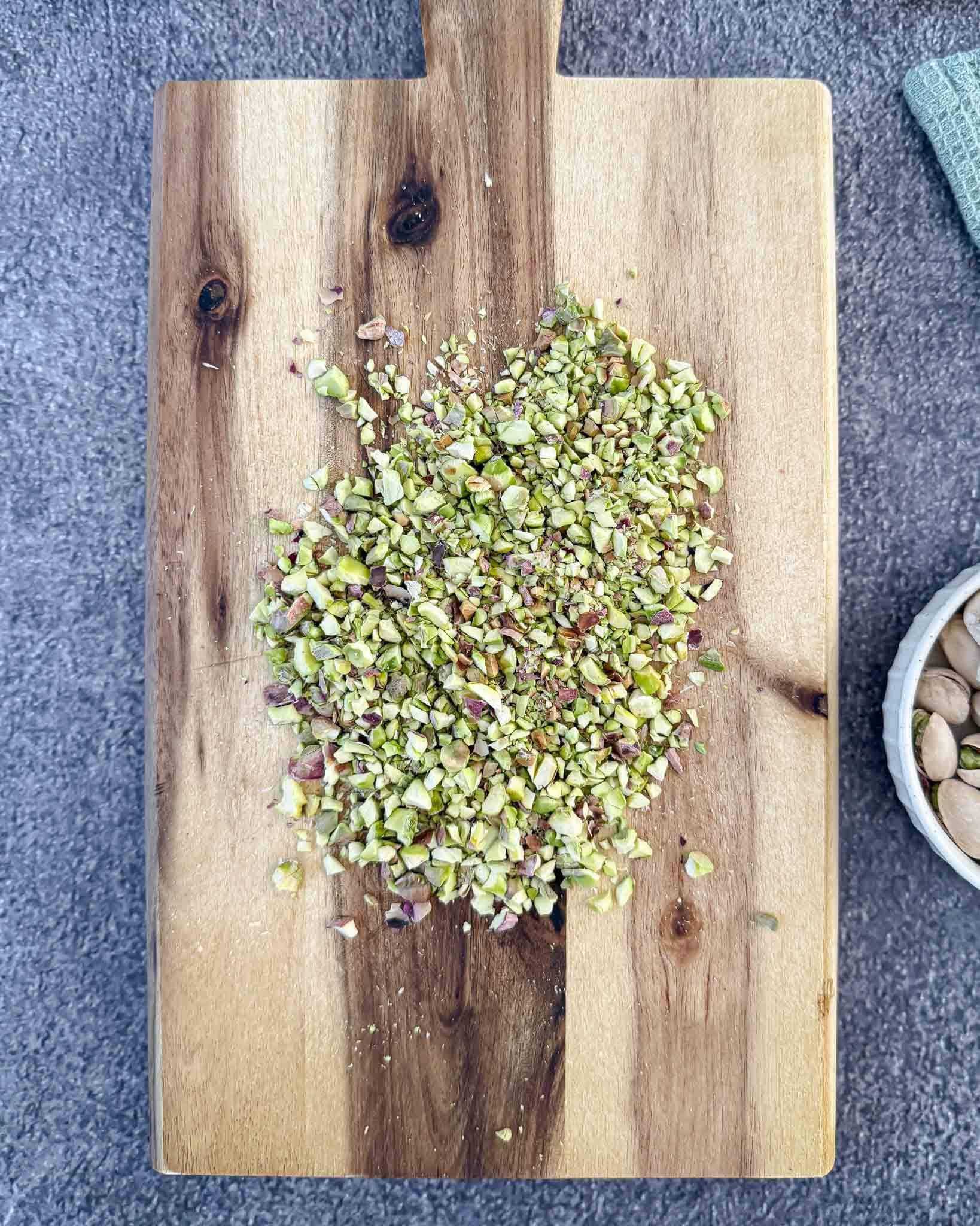 Peiliu susmulkime riešutus. Tiramisu viršų apibarstome kakava, užberiame pistacijas.