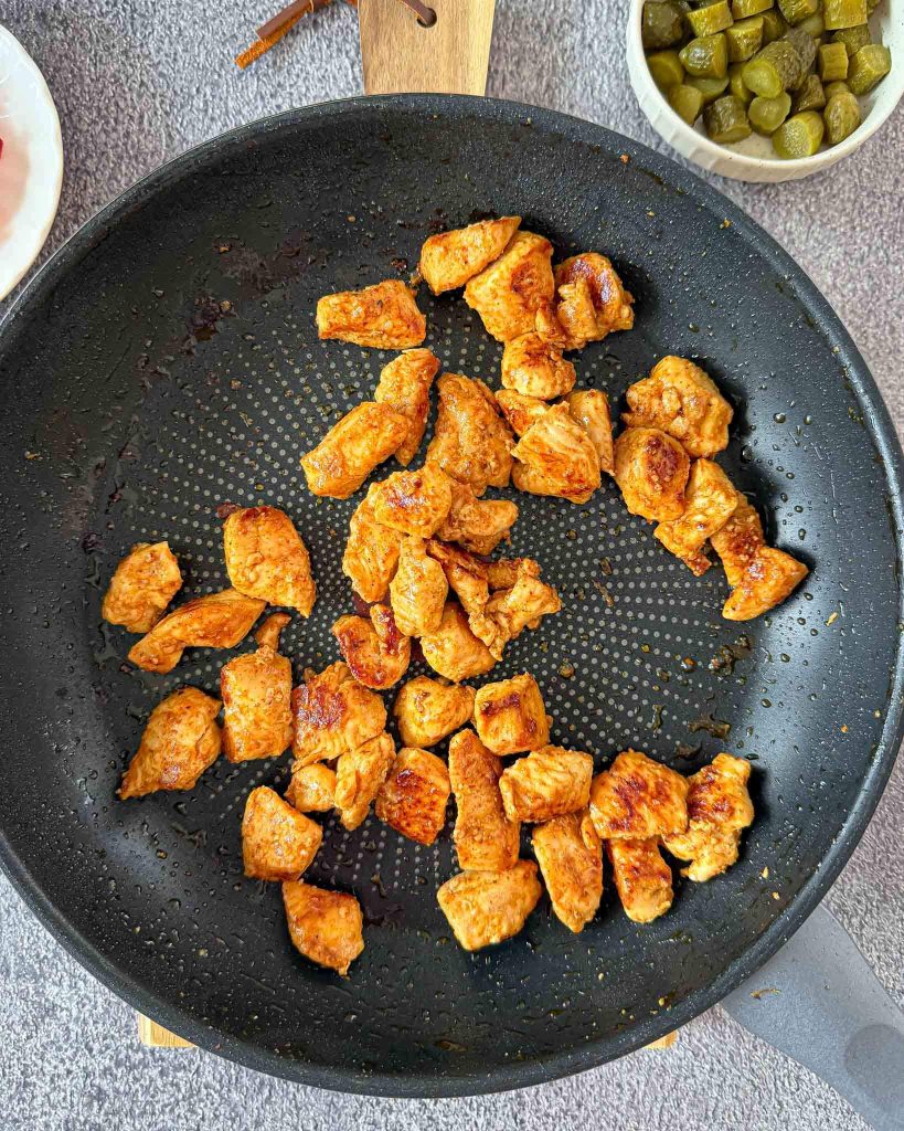 Vištieną supjaustome nedideliais gabaliukais, sumaišome su šlakeliu aliejaus, graikišku jogurtu ir prieskoniais. Jeigu turite laiko, galite šiek tiek pamarinuoti.