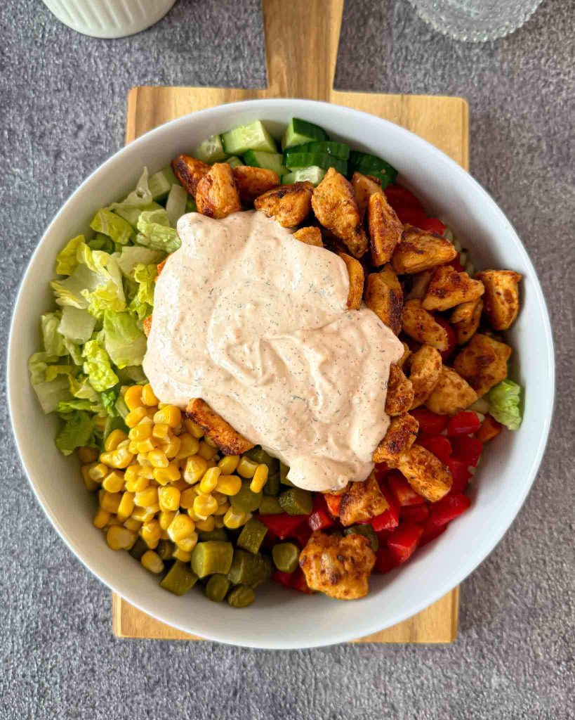 Šios makaronų salotos su vištiena yra kreminės, maistingos, su daug daržovių ir baltymų. Nors salotos skaniausios iškart pagamintos, bet jos puikiai tinka ir į pietų dėžutę. Jų nereikia šildyti, o galima valgyti ir šaltas. Taip pat privalumas, kad kitą dieną makaronai netampa sausi, nes padažo naudojau ganėtinai daug. Jį gaminau su graikišku jogurtu, o ne tik su majonezu.