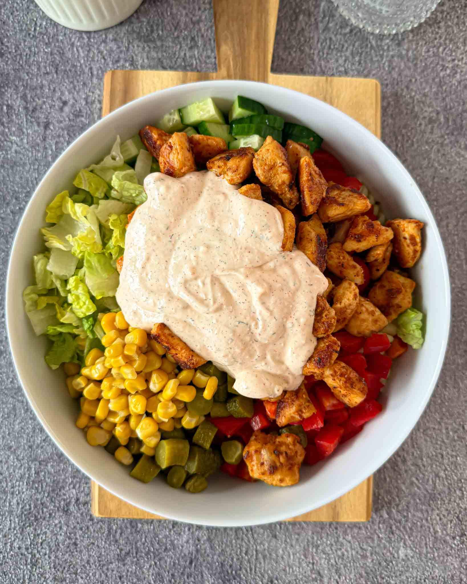 • Makaronų salotos su vištienaMakaronų salotos su vištiena ir daržovėmis