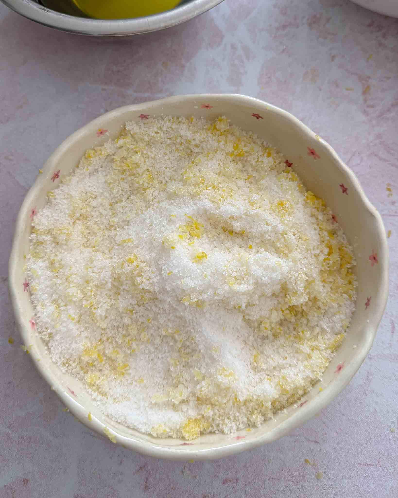 Cukrų sumaišome su citrinos žievele. Jeigu turite laiko, galite palaikyti ilgiau, kad citrinos aromatas įsigertų į cukrų.